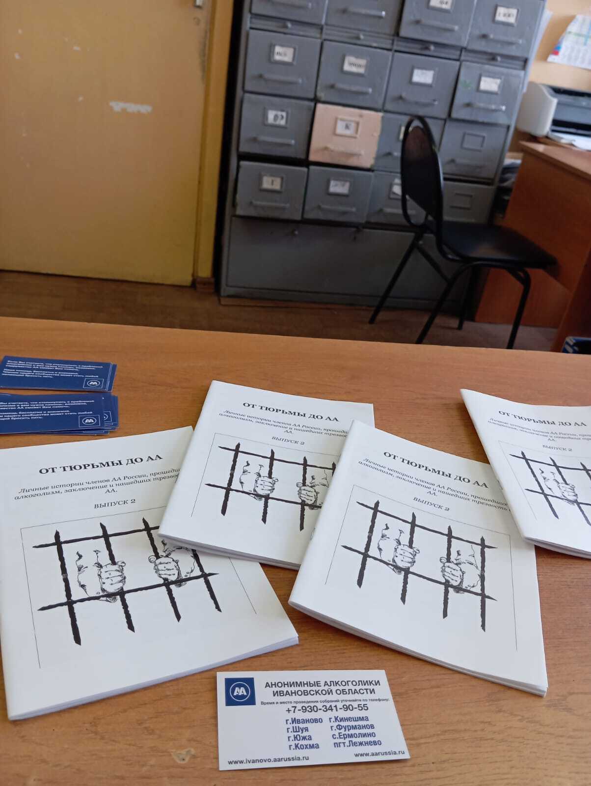 7 апреля была проведена работа в филиале Уголовно-исполнительской Инспекции г. Иваново по Октябрьскому району. Удалось пообщаться с осуждёнными, поговорить о Содружестве АА, показать литературу, пополнить визитками и брошюрами стенд. Там же состоялось знакомство с новыми сотрудниками службы из Южи и Шуи.