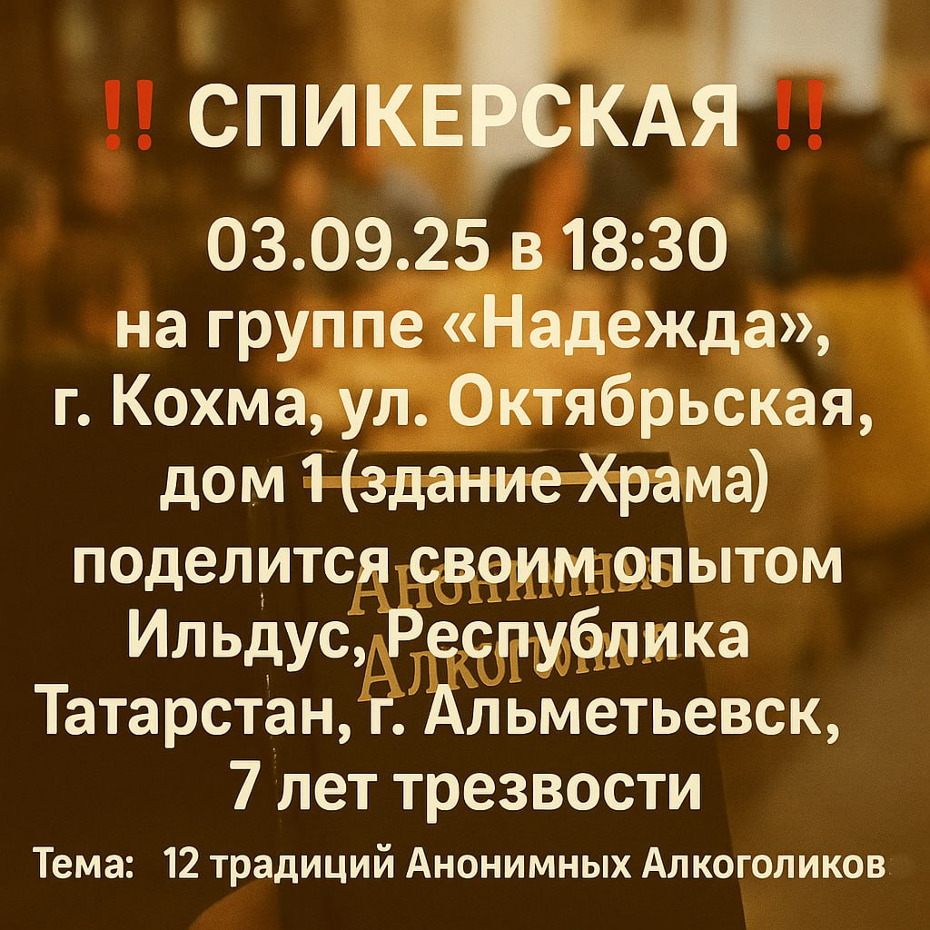 03.09.25 в 18:30 на группе АА «Надежда», г. Кохма, ул. Октябрьская, дом 1 (здание Храма), поделится своим опытом Ильдус, Республика Татарстан, г. Альметьевск, 7 лет трезвости, Тема: "12 традиций Анонимных Алкоголиков".